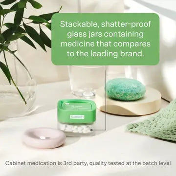 SAME TRUSTED ACTIVE INGREDIENTS, BETTER VALUE. All Cabinet medicines provide the same trusted active ingredients as leading brands at a better value with zero plastic waste. COMPARES TO ZYRTEC. Cabinet 24 Hour Allergy Relief medicine provides fast acting 24 hour relief from common allergy symptoms like sneezing, itchy watery eyes, runny nose, and itchy throat. HIGH-QUALITY MEDICINE. Made with FDA-certified active ingredients that are independently tested by a third-party lab, Cabinet’s 24 hour allergy relief medicine offers the same active ingredients as leading brands (compares to: Zyrtec) with an additional level of trust. REFILLABLE & SUSTAINABLE PACKAGING. We’re on a mission to eliminate single-use plastic in medicine and are proud to offer refillable glass bottles and refills in compostable pouches.