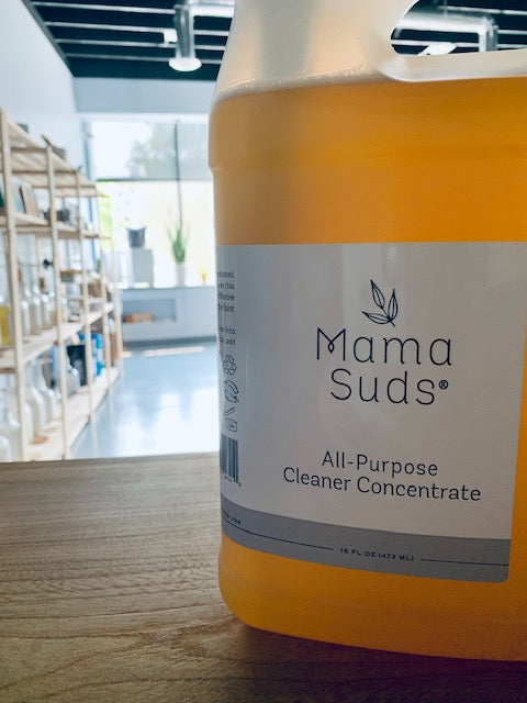 Use: 2 ounces of concentrate to 14 ounces of water. Ingredients: water, MamaSuds handcrafted Castile Soap (Potassium olivate), aloe vera gel juice with citric acid*, pure essential oils of clove bud, organic cinnamon leaf, lemon, eucalyptus radiata, and rosemary