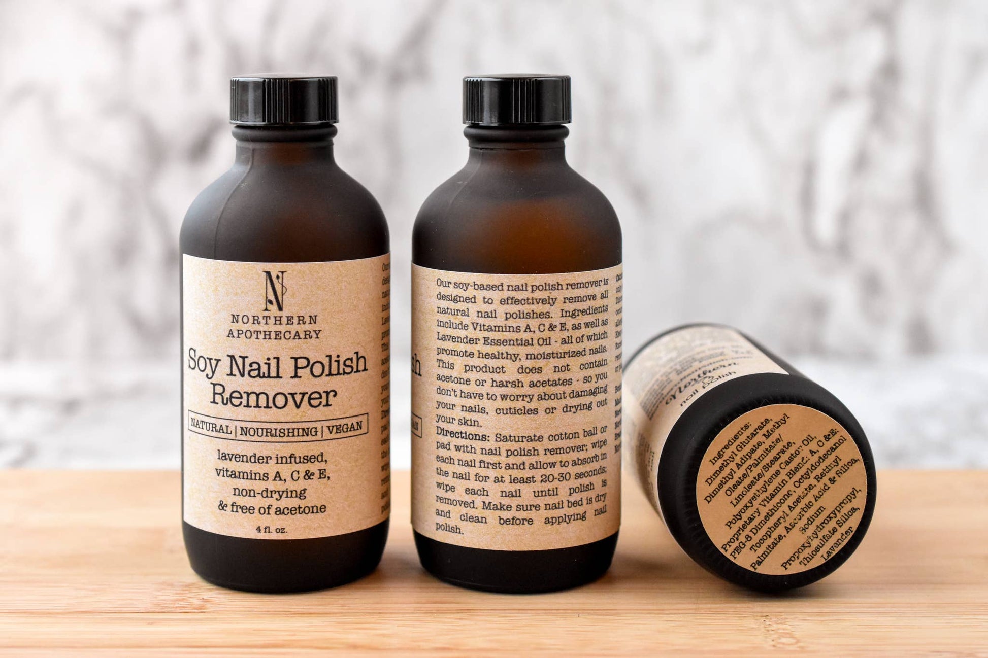 Our soy-based nail polish remover is designed to effectively remove all natural nail polishes. Ingredients include Vitamins A, C & E, as well as Lavender Essential Oil - all of which promote healthy, moisturized nails. This product does not contain acetone or harsh acetates - so you don’t have to worry about damaging your nails, cuticles or drying out your skin