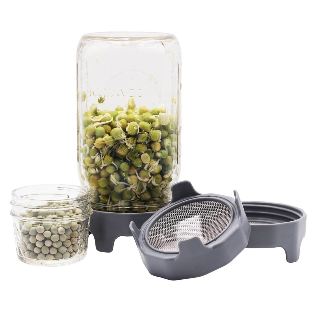 Our heavy duty plastic and stainless steel sprouting lid for Wide Mouth jars has a built-in stand. Will not break or rust.