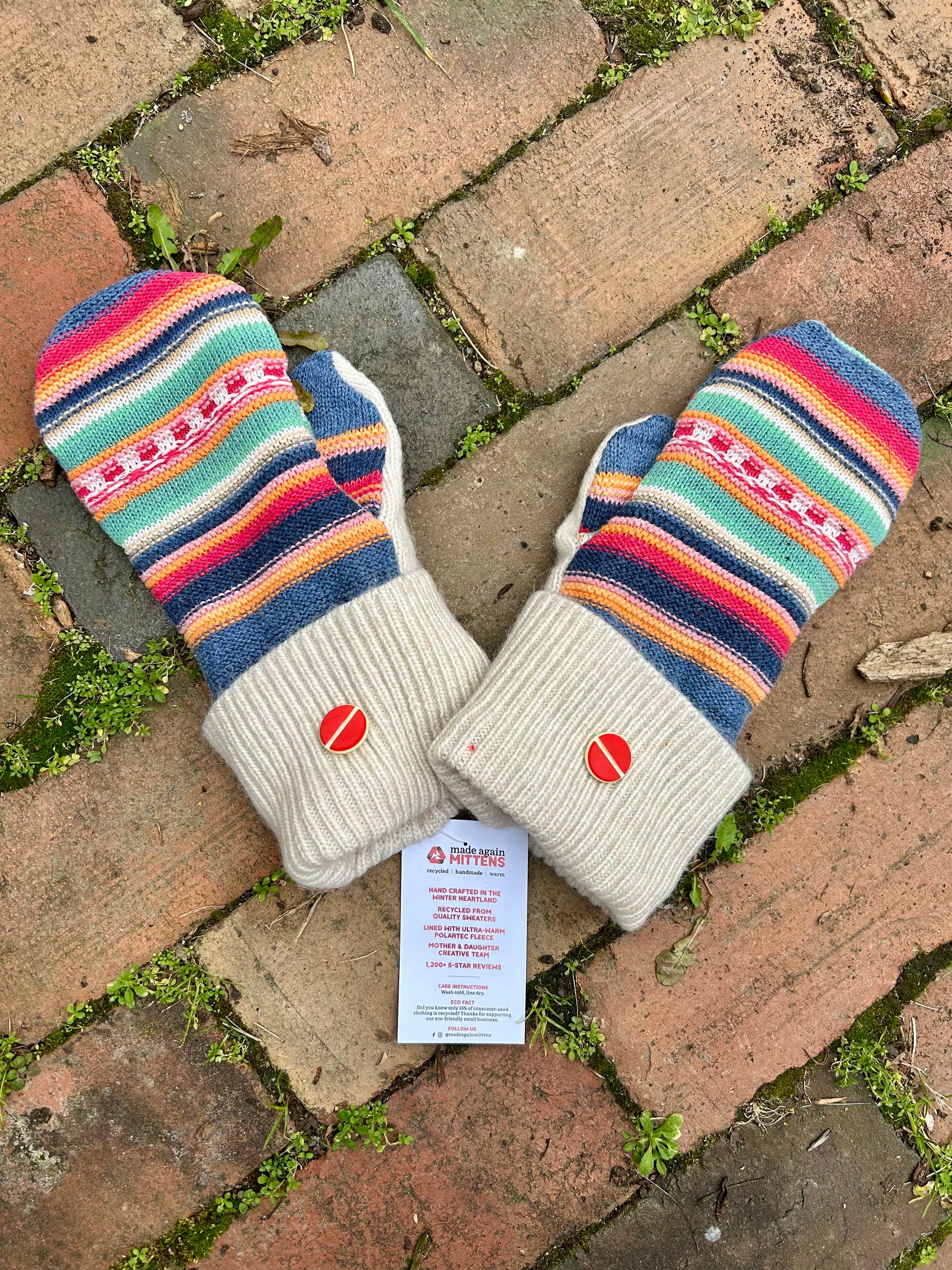 Each pair of warm and cozy sweater mittens is made from upcycled sweaters and lined with polar fleece. Handmade by a Midwest mom and daughter team, each pair is one of a kind.